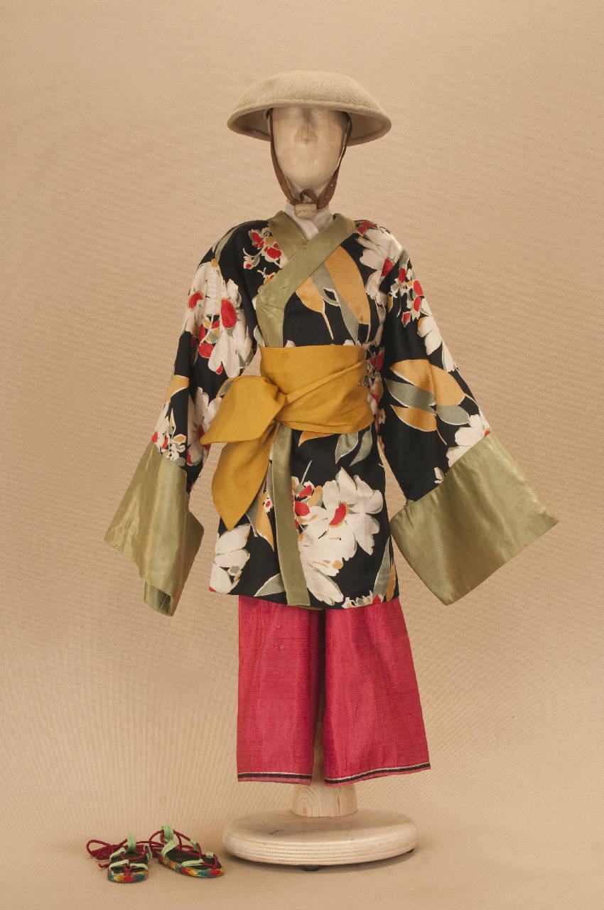 Costume da popolano giapponese composto da pantaloni, giacca, collo, fascia e sandali. Si completa con un cappello che ha il codice C 07881.