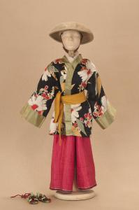 Costume da popolano giapponese composto da pantaloni, giacca, collo, fascia e sandali. Si completa con un cappello che ha il codice C 07880.