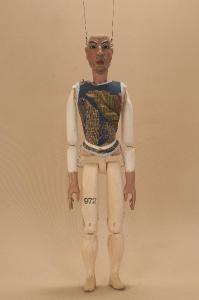 Testa in legno di tiglio fissata al corpo tramite ferro; occhi di vetro; bocca fissa; corpo grande in abete; gambe attaccate con ferro al bacino; ginocchia ad incastro; mani in tiglio con dita scolpite e separate. Bilancino originale per coppie metodo Holden.