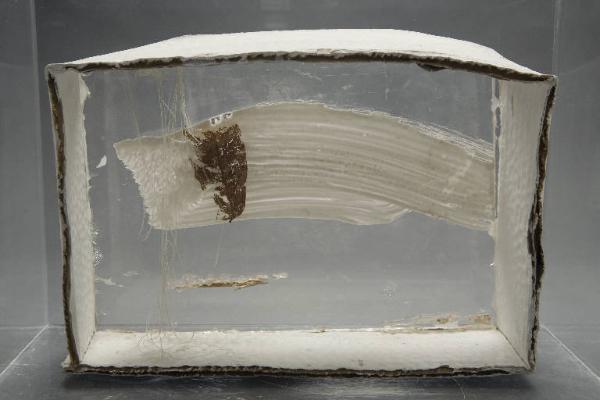 Cella due, spazio mistico di forma parallelepipeda, tinta interamente con tempera bianca, aperta al recto e chiusa al verso da un vetro sul quale spicca una pennellatabianca e una stesura di colla trasparente a rilievo; a sinistra una foglia secca. Dal soffitto, nella porzione sinistra, pendono fili bianchi.\nLa cella è conservata all'interno di una teca in plexiglass.