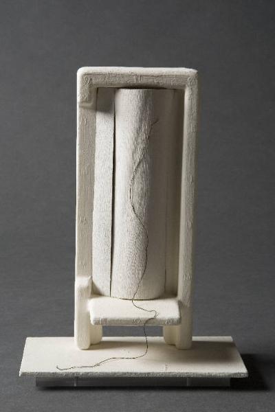 Forma bianca, struttura verticale con clipeo al verso e breve sporgenza orizzontale alla base. La porzione centrale frontale in legno è convesso. Un filo nero di refe parte dall'alto e si conclude sulla sottile base rettangolare lignea.\nLa Forma Bianca è conservata all'interno di una teca in plexiglass.