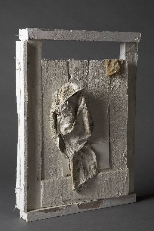 Forma bianca, entro una piccola antina lignea di recupero, con assi verticali e cornice, tinta in bianco opaco. A sinistra un vistoso drappo accartocciato, bianco opaco e impregnato di vinavil, si adagia nella porzione inferiore della composizione su di un vetro rettangolare anch'esso dipinto. In alto a destra un frammento di tela, dal quale partono numerosi fili di refe. La porzione alta dell'opera presenta un'apertura, scrostature volute dall'artista, lungo i bordi superiore ed inferiore.