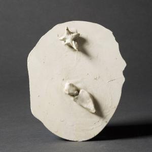 Forma bianca, su una base ovale, coperta da uno spesso strato di colore bianco opaco, emerge Gesù Bambino in fasce e coricato, dalle forme stilizzate e rilevate, in alto una stella.
