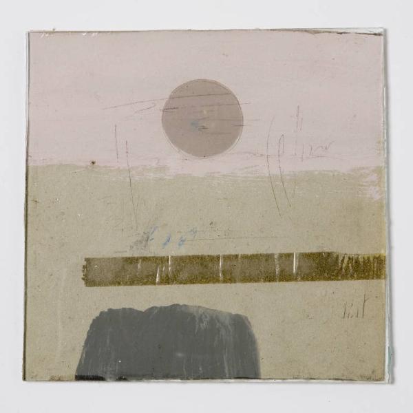Formella quadrata di piccole dimensioni su cartoncino, con un clipeo trasparente rilevato che campeggia al centro di un cielo rosato e sovrasta la terra contrassegnata da una striscia orizzontale di nastro adesivo e da una macchia di colore grigio.\nAl verso il cartoncino è stato interamente coperto da un pesante strato di colore nero opaco, che lascia volutamente intravvedere, in alcuni punti, il blu del cartoncino di recupero usato come base e in modo frammentario la scritta a stampa "Armando Curcio Editore Astronomia".\nAnteriormente la composizione in tecnica mista è protetta da un vetro antico soffiato, di recupero.