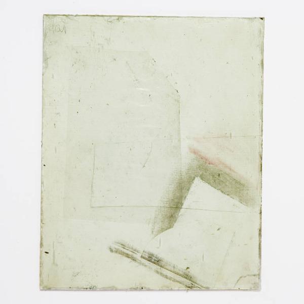 Formella quadrata di piccole dimensioni su cartoncino, con composizione a tecnica mista, protetta anteriormente da un vetro antico soffiato, di recupero. Forme geometriche varie sono ritagliate e applicate sul cartoncino usato come fondo. A sinistra grande rettangolo di pellicola in plastica trasparente e a destra stesura di colore grigio e rosa e quattro circonferenze. L'angolo in basso a destra è ritagliato. Al verso è applicato un ampio rettangolo in cartoncino.