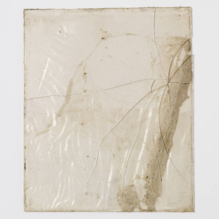 Formella quadrata di piccole dimensioni su cartoncino, con composizione a tecnica mista, protetta anteriormente da un vetro antico soffiato, di recupero. \nLa porzione più consistente del cartoncino è occupata da una ragnatela, disposta ad arco in corrispondenza del lato destro.\nAl verso più strati di cartoncino aggiunti a quello usato come fondo, alcuni volutamente abrasi e schizzo a lapis di una croce.