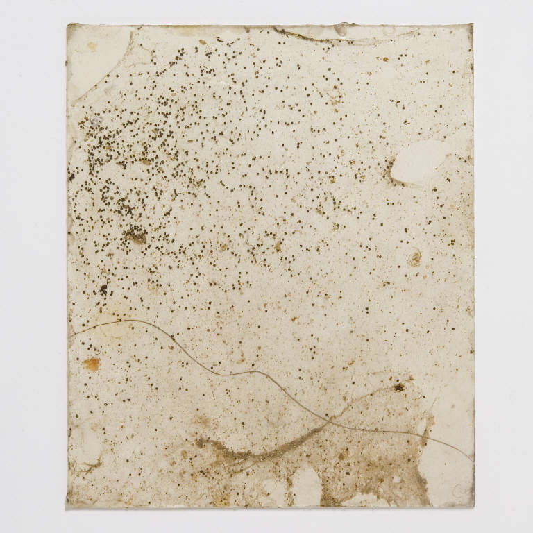 Formella quadrata di piccole dimensioni su cartoncino, con composizione a tecnica mista, protetta anteriormente da un vetro antico soffiato, di recupero. \nLa superficie del cartoncino è completamente occupata da una ragnatela con piccolo ragno incorporato, connotata da numerosi puntini scuri. Nella porzione inferiore segmento curvilineo a lapis che corrisponde, al verso, ad una linea incisa.\nAl verso, in basso a destra, una piccola croce resa con pennarello rosso.