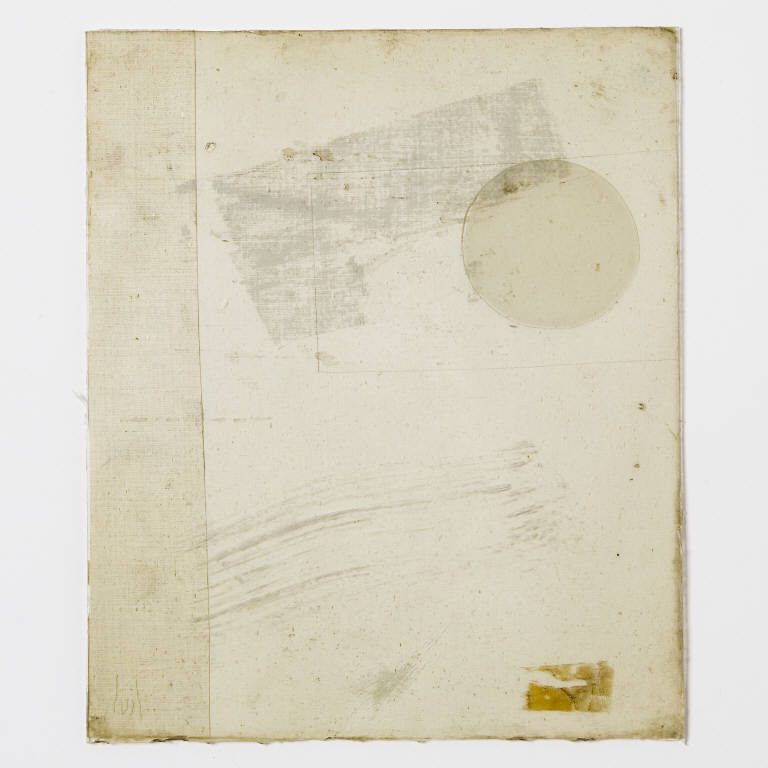 Formella quadrata di piccole dimensioni su cartoncino, con composizione a tecnica mista, protetta anteriormente da un vetro antico soffiato, di recupero. \nSulla superficie del cartoncino, in alto a destra è realizzato un clipeo rilevato trasparente in silicone, compreso entro un rettangolo reso con un semplice perimetro a lapis, affiancato da un altro rettangolo tinto in grigio. A sinistra, per tutta l'altezza, è stato aggiunto un ulteriore cartoncino e in basso a destra, sul vetro esterno è stato incollato un frammento di nastro adesivo ingiallito. Sul vetro, in corrispondenza della parte bassa, sottili pennellate bianche.