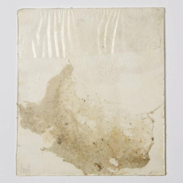 Formella quadrata di piccole dimensioni su cartoncino, con composizione a tecnica mista, protetta anteriormente da un vetro antico soffiato, di recupero. \nSul cartoncino di fondo, si sovrappone uno spesso strato di biacca e, nella porzione superiore, si adagia un vistoso frammento di pellicola di plastica trasparente; in basso al centro una ragnatela con ragno e porzione di intonaco incorporati.\nAl verso, è inciso un rettangolo stretto e lungo con chiazze di colore giallo-ocra, intorno ditate rese a carboncino.