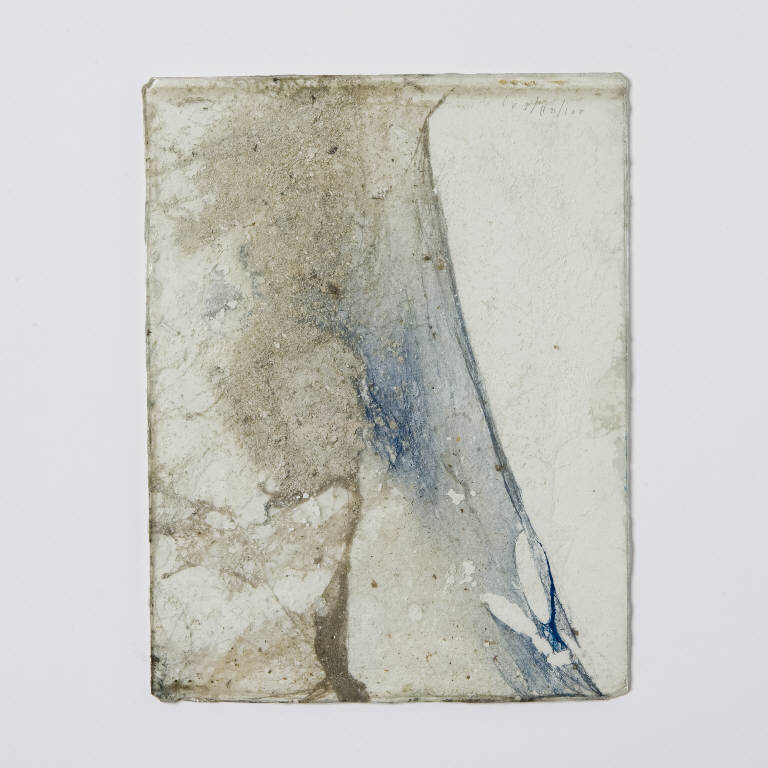 Formella quadrata di piccole dimensioni su cartoncino, con composizione a tecnica mista, protetta anteriormente da un vetro antico soffiato, di recupero. \nIl cartoncino usato come fondo, è coperto da uno spesso strato di biacca ed è caratterizzato, nella porzione sinistra, da una ragnatela con inglobati strati di intonaco vivacizzati, al centro, da una macchia di colore blu. \nAl verso, in basso a destra, una piccola croce greca in pennarello rosso.