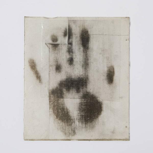 Formella quadrata di piccole dimensioni su cartoncino, con composizione a tecnica mista, protetta anteriormente da un vetro antico soffiato, di recupero. \nL'intero spazio è occupato dall'impronta della mano sinistra di Padre Costantino, impressa sopra vari strati di cartoncino bianco sovrapposti tra loro.\nNella porzione superiore, al centro, un frammento di plastica trasparente. Al verso, nell'angolo in basso a sinistra, il cartoncino di fondo è ritagliato e risulta applicato un cartoncino rettangolare di misura differente. Sempre in posizione centrale, al verso leggera impronta della mano destra.