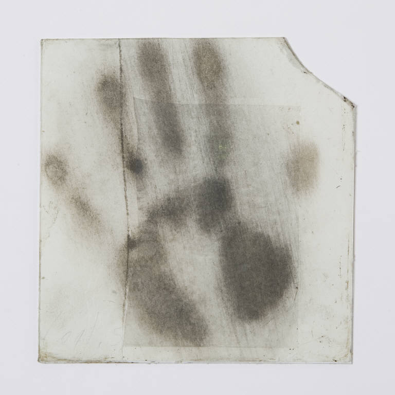 Formella quadrata di piccole dimensioni su cartoncino, con composizione a tecnica mista, protetta anteriormente da un vetro antico soffiato, di recupero. \nIl vetro anteriore presenta nell'angolo in alto a destra una vistosa lacuna, sin dall'origine. L'intero spazio è occupato dall'impronta della mano sinistra di Padre Costantino, protetta da un foglio di plastica trasparente. La composizione è pecorsa a destra da una linea verticale incisa e ripassata a lapis.