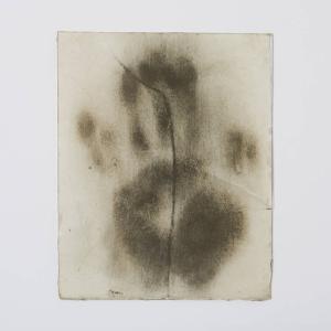Formella quadrata di piccole dimensioni su cartoncino, con composizione a tecnica mista, protetta anteriormente da un vetro antico soffiato, di recupero. L'impronta della mano sinistra dell'artista, resa con colore scuro, campeggia al centro di un ovale tracciato a matita. La mano è percorsa al centro da una linea verticale incisa e ripassata a colore, visibile anche al verso. Nell'angolo in basso a destra una piccola croce greca in pennarello rosso.