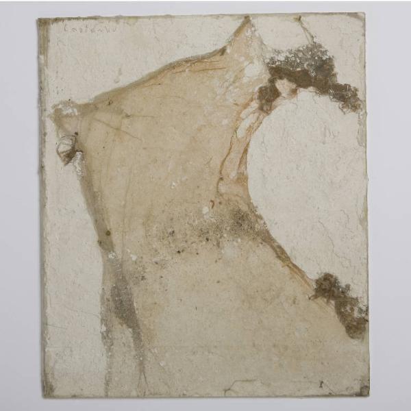 Formella quadrata di piccole dimensioni su cartoncino, con composizione a tecnica mista, protetta anteriormente da un vetro antico soffiato, di recupero. \nSul cartoncino di fondo è stato steso, in modo non uniforme, uno spesso strato di biacca, con l'intento di creare una sorta di parete muraria antica, al centro del quale si adagia una leggera ragnatela, tinta in rosso cotto e trattenuta alle estremità da due frammenti di intonaco dipinto. In alto a sinistra un ragno. Al verso, al centro la congiunzione dei due cartoncini di recupero usati come base.