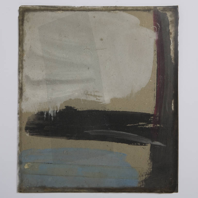 Formella quadrata di piccole dimensioni su cartoncino, con composizione a tecnica mista, protetta anteriormente da un vetro antico soffiato, di recupero. \nNella composizione macchie orizzontali di colore bianco, nero e azzurro; a destra una fascia verticale nera, affiancata da un'altra rosso porpora. Nella porzione inferiore lunga strisica di nastro adesivo e superiormente frammento rettangolare di plastica trasparente. \nAl verso, sopra il cartone di recupero "Astronomia" (Armando Curcio Editore. Astronomia. Alla scoperta del cielo), spessa stesura di colore nero, con sovrapposta una freccia bianca. Incollata al verso un'etichetta rettangolare in carta bianca con il numero d'inventario 2 a biro nera.