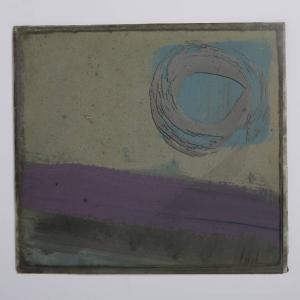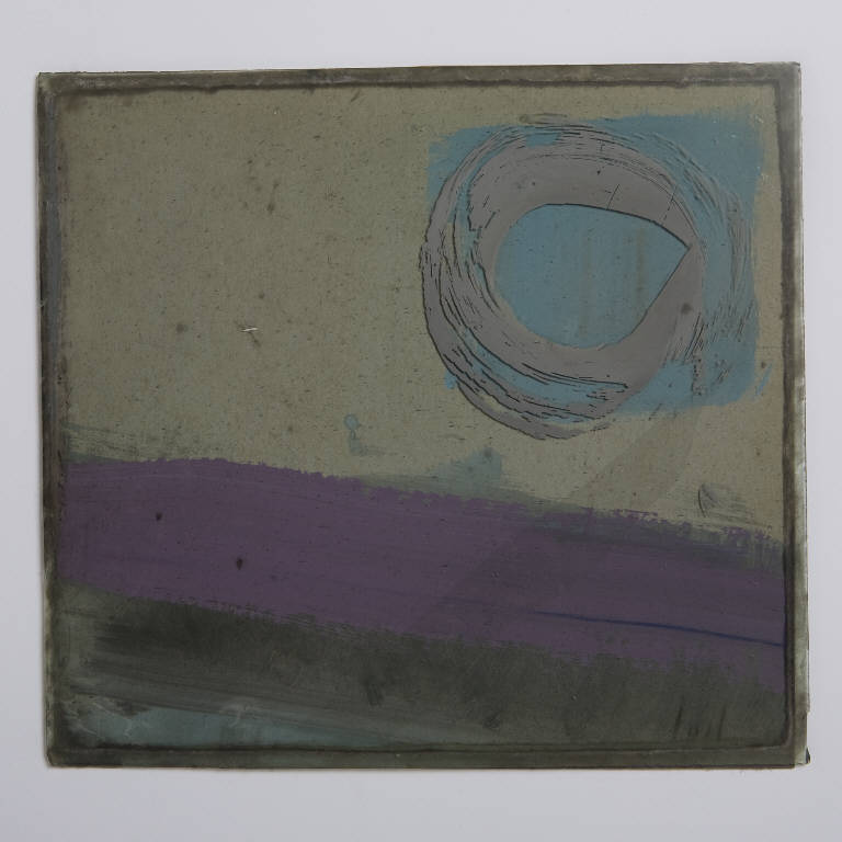 Formella quadrata di piccole dimensioni su cartoncino, con composizione a tecnica mista, protetta anteriormente da un vetro antico soffiato, di recupero. \nSulla superficie scura del cartoncino di fondo, risalta a destra un quadrato azzurro, sormontato da un clipeo grigio, dipinto sul vetro. Più sotto stesura di colore viola, quindi grigio e azzurro acqua. Disposto in obliquo un frammento di plastica trasparente.\nAl verso, sopra il cartone di recupero "Astronomia" (Armando Curcio Editore. Astronomia. Alla scoperta del cielo), spessa stesura di colore nero. Incollata al verso un'etichetta rettangolare in carta bianca con il numero d'inventario 14 a biro nera, si intravvede il vecchio numero d'inventario 3249, sottostante e scritto in rosso.
