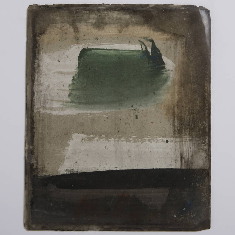 Formella quadrata di piccole dimensioni su cartoncino, con composizione a tecnica mista, protetta anteriormente da un vetro antico soffiato, di recupero. \nIl fondo della composizione presenta varie stesure di colore: beige, bianco, marrone e nero. In posizione centrale è realizzato un alto rettangolo verde; in più punti labili tracce di colore blu.\nIl vetro di recupero ed il sottostante cartoncino di base, sono rotti sin dall'origine nell'angolo in basso a sinistra.\nAl verso, sopra il cartone di recupero "Astronomia" (Armando Curcio Editore. Astronomia. Alla scoperta del cielo), spessa stesura di colore nero opaco. Incollata al verso un'etichetta rettangolare in carta bianca con il numero d'inventario 38 a biro nera.