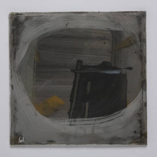 Formella quadrata di piccole dimensioni su cartoncino, con composizione a tecnica mista, protetta anteriormente da un vetro antico soffiato, di recupero. \nEntro un ovale reso con pennellate in grigio chiaro, su una base di fondo più scura, si stagliano a destra un rettangolo nero e a sinistra una macchia color ocra, più sopra un frammento di pellicola di plastica trasparente.\nAl verso, sopra il cartone di recupero "Astronomia" (Armando Curcio Editore. Astronomia. Alla scoperta del cielo), spessa stesura di colore nero opaco che lascia però scoperto il bordo perimetrale bianco. Al verso un'etichetta rettangolare in carta bianca adesiva con il numero d'inventario 2742 in pennarello nero e sopra, depennato da due righe nere, il vecchio numero d'inventario 3276 a pennarello rosso.