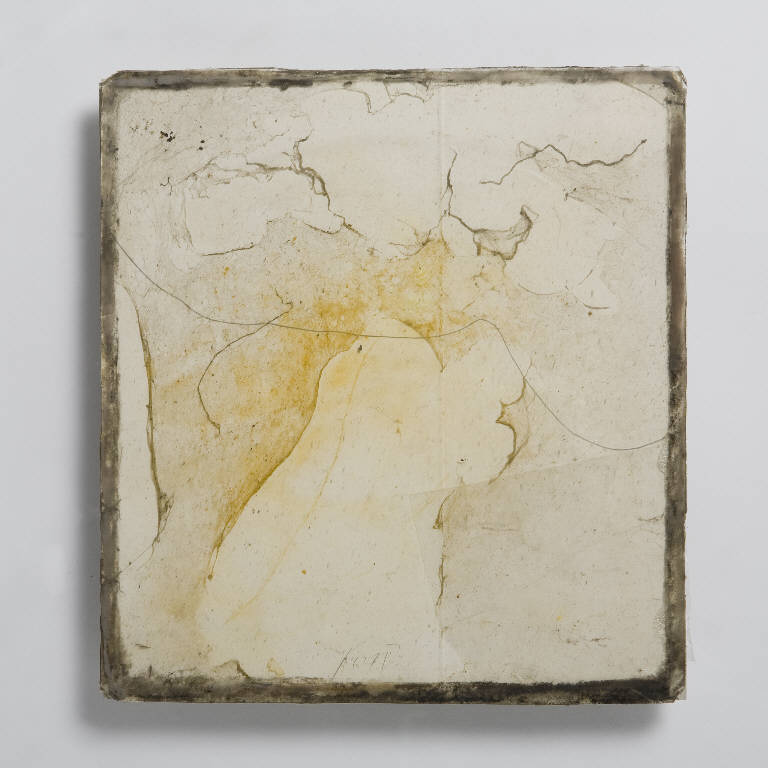 Formella quadrata di piccole dimensioni su cartoncino, con composizione a tecnica mista, protetta anteriormente da un vetro antico soffiato, di recupero. \nIl Trasparente, di forma quadrata, ospita una sottilissima ragnatela che risalta su un fondo, tinteggiato in alcuni punti in color giallo ocra. Al centro una leggera linea curva orizzontale, tratteggiata a matita. Il bordo perimetrale è nero sul cartoncino con campitura grigio chiaro sul vetro.\nAl verso, è stato sovrapposto un quadrato in compensato di minori dimensioni rispetto al fondo della composizione, tinto in bianco, che tramite 5 clipei di silicone aderisce alla teca in plexiglass. Freccia in pennarello nero per indicare il verso.