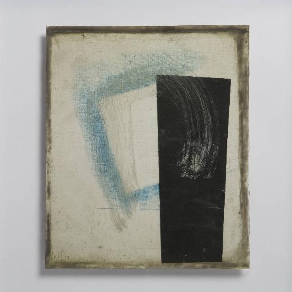 Formella quadrata di piccole dimensioni su cartoncino, con composizione a tecnica mista, protetta anteriormente da un vetro antico soffiato, di recupero. \nLa composizione si caratterizza per la presenza, al centro, di un quadrato dai lati profilati in color azzurro e più sotto di un rettangolo delineato a lapis . La porzione destra è occupata da un ampio rettangolo in carta nera, disposto in verticale, dal quale parte una pennellata bianca che forma un semicerchio, percorrendo anche parte del quadrato azzurro.\nAl verso, la composizione aderisce, tramite 5 clipei in silicone, alla teca in plexiglass. Freccia in pennarello nero per indicare il verso.