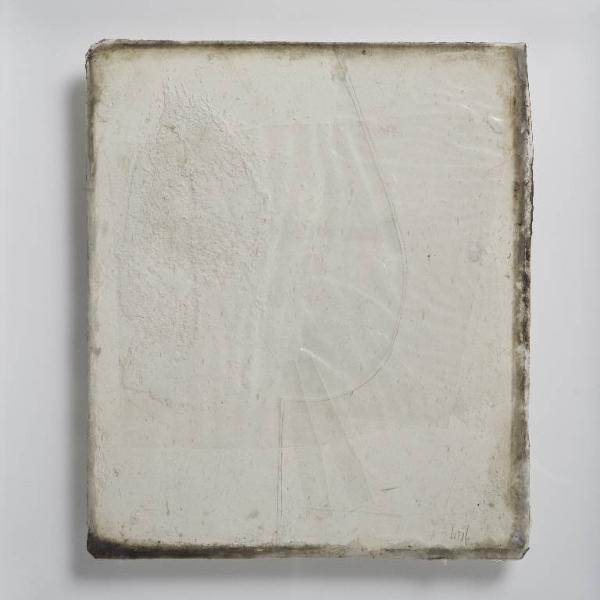 Formella quadrata di piccole dimensioni su cartoncino, con composizione a tecnica mista, protetta anteriormente da un vetro antico soffiato, di recupero. \nLa composizione a monocromo in bianco, presenta a sinistra un vistoso ovale realizzato con più strati materici, protetto da un frammenti di plastica trasparente che fingono due raggi nella porzione inferiore. Al centro una linea curva a lapis, rimarca il punto di congiunzione tra i cartoni usati per la composizione.\nAl verso, il cartoncino presenta una grossa porzione di plexiglass rettangolare ambrato che serve per distanziare e far aderire la composizione alla teca ed esternamente 3 piccoli cubi in plexiglass, di cui quello centrale dotato di gancio.