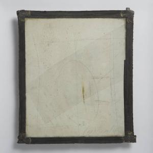 Formella quadrata di piccole dimensioni su cartoncino, con composizione a tecnica mista, protetta anteriormente da un vetro antico soffiato, di recupero. \nIl cartoncino chiaro, utilizzato come fondo, presenta abrasioni create dall'artista in alto a sinistra, un piccolo rettangolo dal perimetro inciso e in basso a destra un altro piccolo cerchio abraso. Sparsi scarabocchi a lapis, al centro un ovale con taglio verticale, ripassato in color ocra. Un frammento di plastica trasparente è disposto in obliquo.\nAl verso, è disposta a sinistra in verticale una fascia in cartoncino marrone; porzione di plexiglass rettangolare ambrata che serve per distanziare e far aderire la composizione alla teca ed esternamente 3 piccoli cubi in plexiglass, di cui quello centrale dotato di gancio.