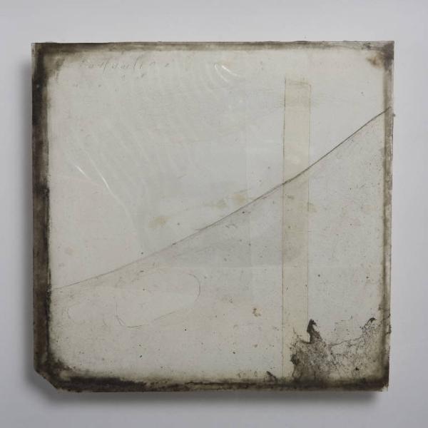 Formella quadrata di piccole dimensioni su cartoncino, con composizione a tecnica mista, protetta anteriormente da un vetro antico soffiato, di recupero. \nUna leggera e chiara ragnatela è disposta in obliquo sul cartoncino ed è protetta da un vistoso frammento di plastica trasparente verticale. Sul lato destro un lungo pezzo di nastro adesivo verticale. L'angolo in basso a sinistra è rotto sin dall'origine.\nAl verso, due cartoncini affiancati con al centro un grande asterisco a lapis, coperto da un rettangolo di plexiglass ambrato che serve per distanziare e far aderire la composizione alla teca ed esternamente 3 piccoli cubi in plexiglass, di cui quello centrale dotato di gancio.