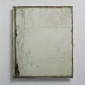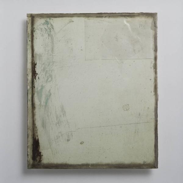 Formella quadrata di piccole dimensioni su cartoncino, con composizione a tecnica mista, protetta anteriormente da un vetro antico soffiato, di recupero. \nCollage a monocoromo che si caratterizza per la presenza di più cartoncini, con forme diverse, sovrapposti o affiancati tra loro. La composizione è vivacizzata da una veloce stesura di colore azzurro acqua e marrone lungo il lato sinistro, in corrispondenza del vetro. A destra in alto rettangolo in carta, cui è sovrapposta una pellicola di plastica trasparente. Più sotto un piccolo clipeo abraso e un taglio orizzontale, ripassato a lapis.\nAl verso, più cartoncini e al centro un rettangolo di plexiglass che serve per distanziare e far aderire la composizione alla teca ed esternamente 2 piccoli parallelepipedi ed un cubo in plexiglass dotato di gancio.