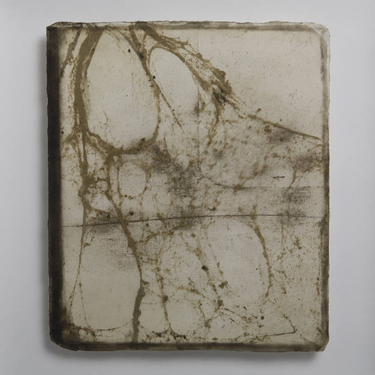 Formella quadrata di piccole dimensioni su cartoncino, con composizione a tecnica mista, protetta anteriormente da un vetro antico soffiato, di recupero. \nLa composizione consiste in un fondo bianco reso attraverso l'unione di più cartoncini profilati a lapis, sul quale si adagia una leggera e sottile ragnatela con ragno incorporato. I bordi del vetro sono scuriti, a fingere una sorta di cornice. \nAl verso, è stato utilizzato un cartoncino con il disegno di un viso, foto e scritte, sul quale si sovrappone solo una leggera stesura di colore bianco. Al verso anche un grosso rettangolo di plexiglass che serve per distanziare e far aderire la composizione alla teca ed esternamente 3 piccoli cubi in plexiglass, di cui quello centrale dotato di gancio.