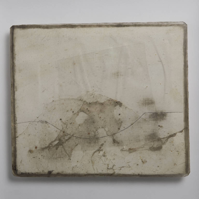 Formella quadrata di piccole dimensioni su cartoncino, con composizione a tecnica mista, protetta anteriormente da un vetro antico soffiato, di recupero. \nLa porzione bassa della composizione ospita una leggera e sottile ragnatela con frammenti di intonaco incorporati, separata dalla porzione superiore, lasciata bianca, da una riga ondulata parzialmente incisa e ripassata a lapis. Al centro ampio pezzo di plastica trasparente. \nAl verso, tavoletta rettangolare lignea tinta di nero opaco con leggere abrasioni ed esternamente 6 piccoli cubi in plexiglass, di cui uno dotato di gancio.