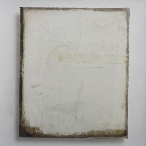 Formella quadrata di piccole dimensioni su cartoncino, con composizione a tecnica mista, protetta anteriormente da un vetro antico soffiato, di recupero. \nLa composizione consiste in varie stesure di biacca che creano un effetto materico, alternato ad aree volutamente abrase; al centro incisione verticale, frammenti di plastica trasparente e lungo pezzo di nastro adesivo disposto in orizzontale. Lungo i bordi del vetro stesura di colore scuro a fingere una sorta di cornice. \nAl verso, due cartoncini uniti, sul maggiore dei quali è disegnato un asterisco a lapis. Al verso un grosso quadrato di plexiglass che serve per distanziare e far aderire la composizione alla teca ed esternamente 3 piccoli cubi in plexiglass, di cui quello centrale dotato di gancio.