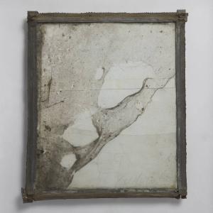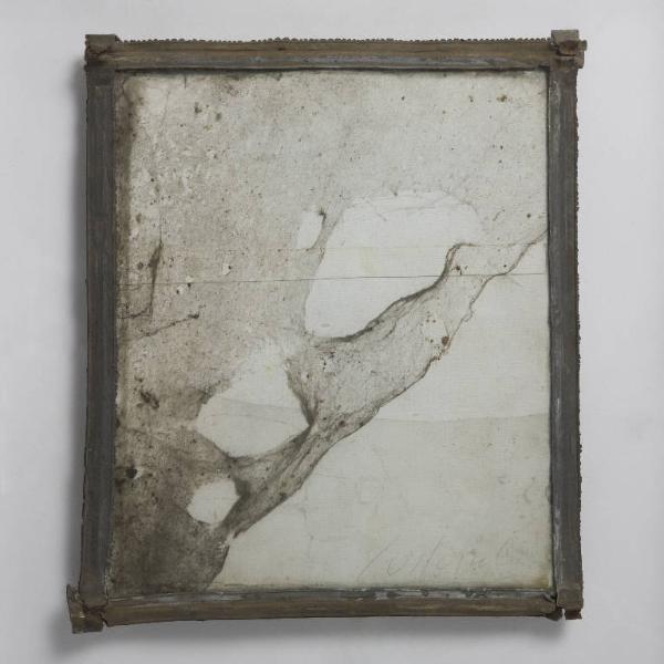 Formella quadrata di piccole dimensioni su cartoncino, con composizione a tecnica mista, protetta anteriormente da un vetro antico soffiato, di recupero. \nSul cartone di fondo bianco, caratterizzato da un sottile cartoncino rettangolare disposto in orizzontale, si adagia un'ampia ragnatela. Inferiormente un rettangolo in plastica trasparente. La composizione è custodita entro una cornice realizzata con piombo di scarto. \nAl verso, è aggiunto un ulteriore cartoncino grigio con freccia a pennarello nero; sono incollati 5 clipei in silicone per distanziare e far aderire la composizione alla teca; esternamente 3 piccoli cubi in plexiglass.