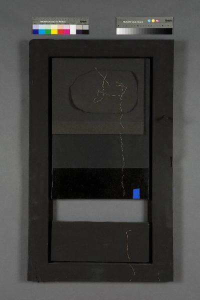 La struttura di base della composizione è costituita da un'antina lignea di recupero, probabilmente ottocentesca, della quale è utilizzata unicamente la cornice esterna; al suo interno è stata posizianata una piccola tela con telaio ligneo nella porzione superiore e inferiormente una tavola lignea rettangolare. L'antina lignea e le parti inserite al centro sono state tinteggiate in nero opaco. Alla porzione alta della tela è stata addossata un'ulteriore tavoletta rettangolare, rivestita di più strati di cartoncino, di cui quello centrale di forma ovoidale e dai contorni non ben definiti, da quest'ultimo parte un filo bianco di refe che prossegue in verticale nella porzione inferiore della composizione. Sulla tela, in basso a destra, è dipinto un piccolo rettangolo azzurro intenso. Sul bordo dell'antina, a destra, si conserva il gancio metallico originario, tinto anch'esso di nero, mantre al verso, a sinistra, si conserva la bocchetta in ottone lavorato.