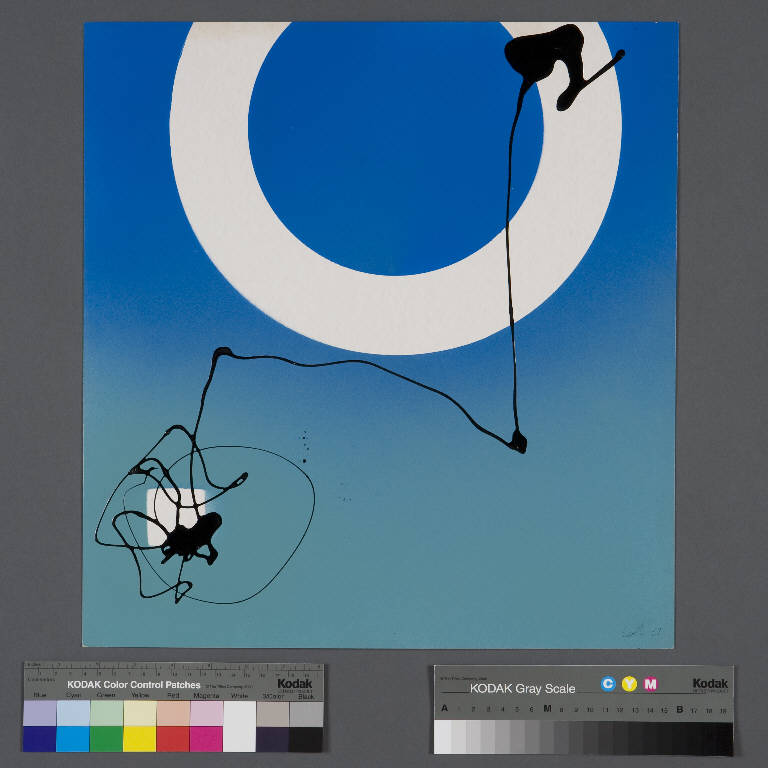 Sulla superficie del cartoncino di fondo con colore dato a spry che dal blu degrada verso l'azzurro acqua, si staglia un ampio clipeo blu, tagliato nella porzione alta e contornato da una fascia bianca. Nell'angolo in basso a sinistra un piccolo quadrato bianco è parzialmente coperto da una macchia in vernice nera con sottili linee che raggiungono l'angolo in alto a destra creando un'altra macchia nera. Al verso grossa X a matita.