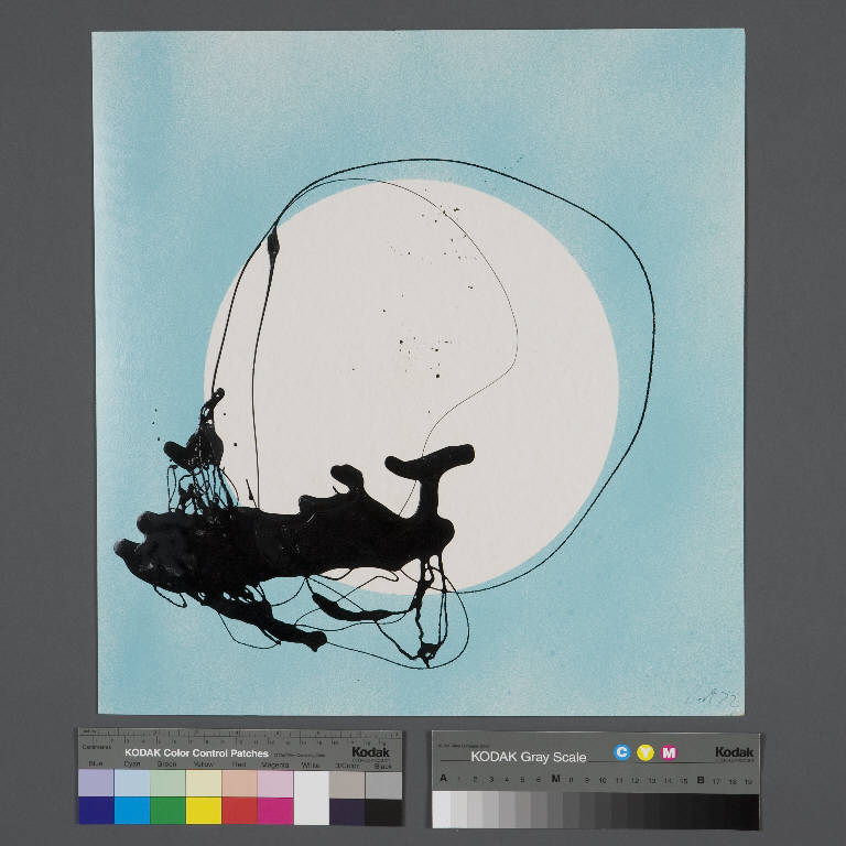 Un ampio clipeo bianco si staglia sulla superficie del cartoncino di fondo di un colore azzurro intenso dato a spruzzo. A sinistra in basso, una spessa macchia di vernice nera, dalla quale parte una sottile linea curva chiusa che segue parzialmente l'andamento del clipeo bianco di fondo.\nAl verso grossa X a matita e macchie di vernice nera.