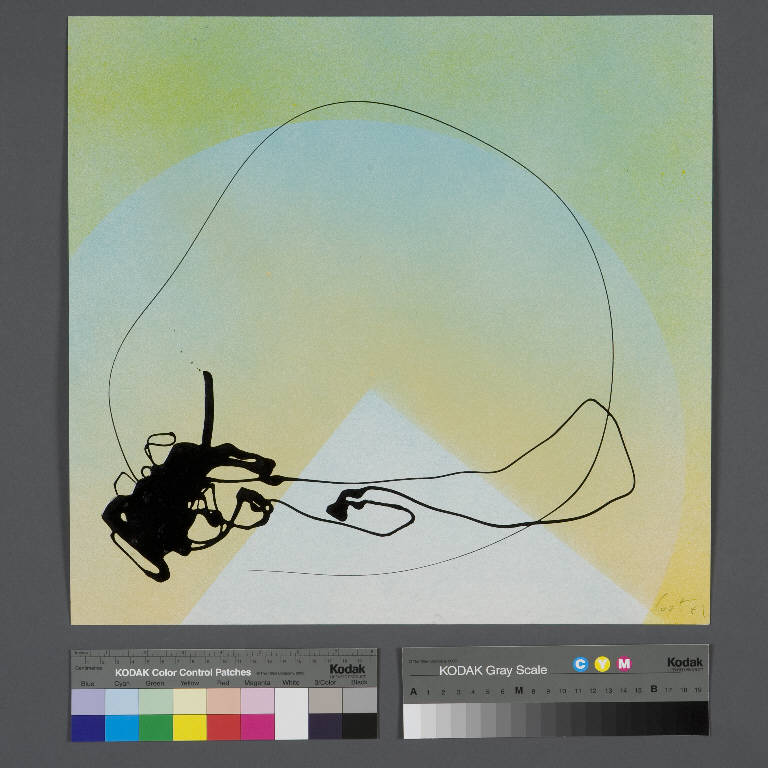 Un ampio clipeo giallo-azzurro sfumato, occupa l'intera superficie del cartoncino di fondo ed è interrotto nella porzione inferiore da un triangolo azzurro chiaro. Al centro una spessa macchia di vernice nera, dalla quale parte una sottile linea che forma un grosso cerchio. Esternamente al clipeo centrale, la superficie di fondo assume, in basso a destra, una colorazione gialla intensa data a spruzzo, che degrada sino ad arrivare ad uno sfumato giallo-verde-azzurro.\nAl verso due grosse X a matita.