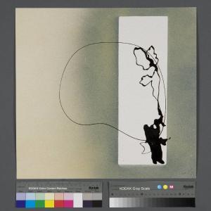 Un ampio rettangolo chiaro è disposto verticalmente a destra della composizione, su di esso si distribuisce una spessa macchia di vernice nera, dalla quale parte una sottile linea curva chiusa. Esternamente sulla superficie di fondo è dato a spruzzo in maniera degradante un color grigio-giallo.\nAl verso due grosse X a matita.