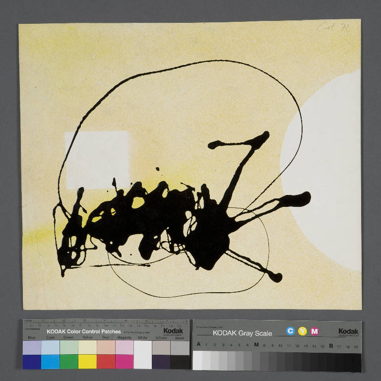 - NOTIZIE STORICO CRITICHE Composizioni, create con materiali di recupero, cartoni, vetri, fili, legni, ferri, colori, che colpiscono per l'elementarità di immagine, di tecniche, di materiali. Per la realizzarione Padre Costantino usava solitamente una tempera da muro chiamata "Ducotone", filo di refe, una colla trasparente specifica per vetro detta "Peligom" della ditta Pelikan.\nPadre Costantino, che utilizza materie povere, asserisce: "Voglio costruire con materie povere come il pane".\nSerie di n.19 composizioni su cartoncino quadrato intitolate" Macchie guidate", nere e bianche o policrome. Nelle opere policrome la vernice è data a spry, spruzzata con una bomboletta sul cartoncino di fondo, quindi lo smalto è fatto colare direttamente dal pennello.\nE' un corpus di opere inedite, privo di scheda inventariale; solo una intitolata "Studio" (NSK 724 ) è dotata di scheda manoscritta M20.