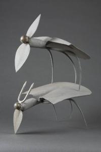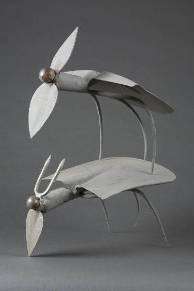 Due coleotteri sovrapposti in accoppiamento, resi utilizzando due badili per i corpi, due forche per le zampe e due piccole zappe per le teste. Gli insetti sono tinteggiati in grigio opaco, su un colore dorato di fondo, mentre le teste e le zampe sono dipinte in argento.