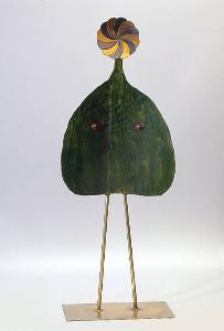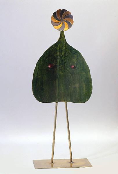 Figura femminile stilizzata con corpo tinto di verde e capezzoli evidenziati, resi con due bulloni. La testa è costituita da un elemento decorativo a forma di girandola (in origine era una maniglia). Poggia su base a lastra rettangolare.