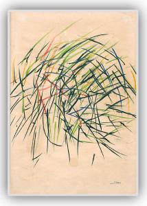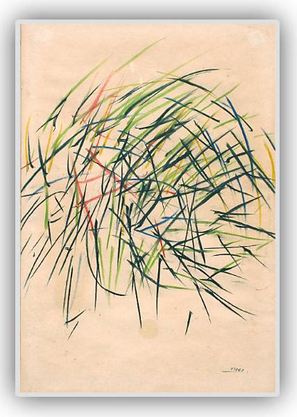 Con veloci tratti policromi è delineato un riccio stilizzato. Il disegno è incollato su di un pannello ligneo tinto di nero, racchiuso entro una sottile cornice lignea a listello, protetta da vetro.