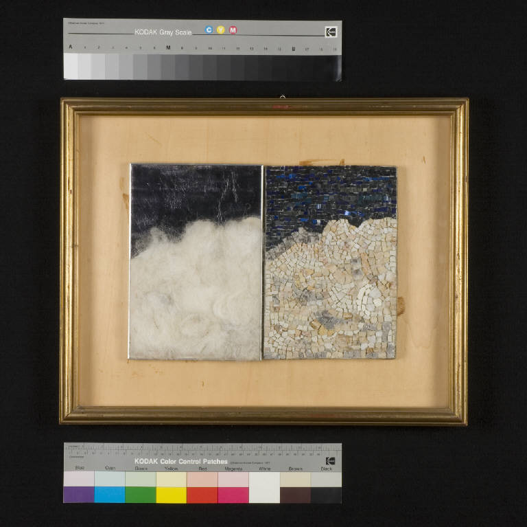 Dittico con mosaico e lana. All'interno di un unico pannello in compensato, entro cornice lignea dorata, sono affiancate due tavolette: a sinistra resa con lana grezza nella porzione inferiore e stesura di colore nero superiormente, a destra realizzata con tessere musive azzurre (il cielo) e bianche nella porzione inferiore.