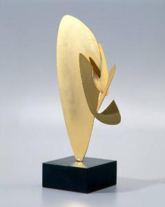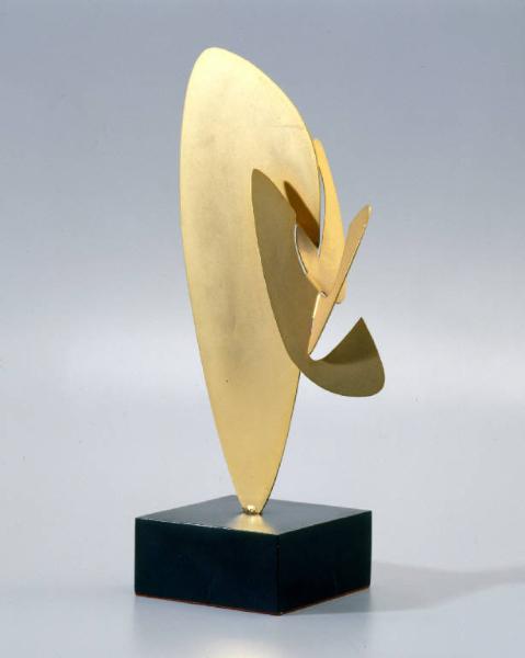 Plastica da tavola-struttura operazionale, forma geometrica con un singolo modulo di forma trapezio-ovoidale dorato, tipico della produzione del Maestro.