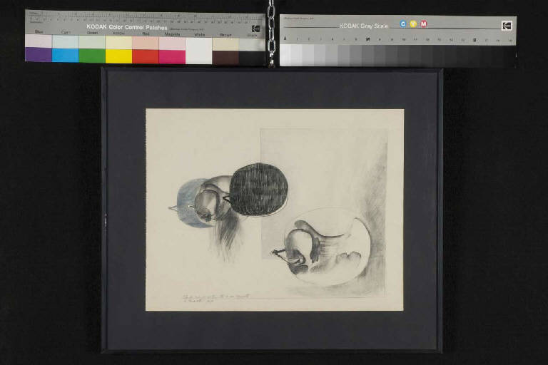 Progetto per scultura entro cornice, su foglio di cartone: su un fondo rettangolare si staglia una forma in primo piano a destra in basso, mentre a sinistra al centro si ripetono tre forme affiancate e semivrapposte dipinte a carboncino, matita e pastello blu.