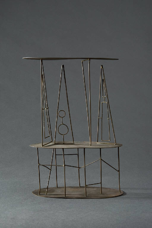 Soggetto astratto con figure filiformi geometriche, bacchette ed ellissi, disposte tra due piani formati da lamine ovali.