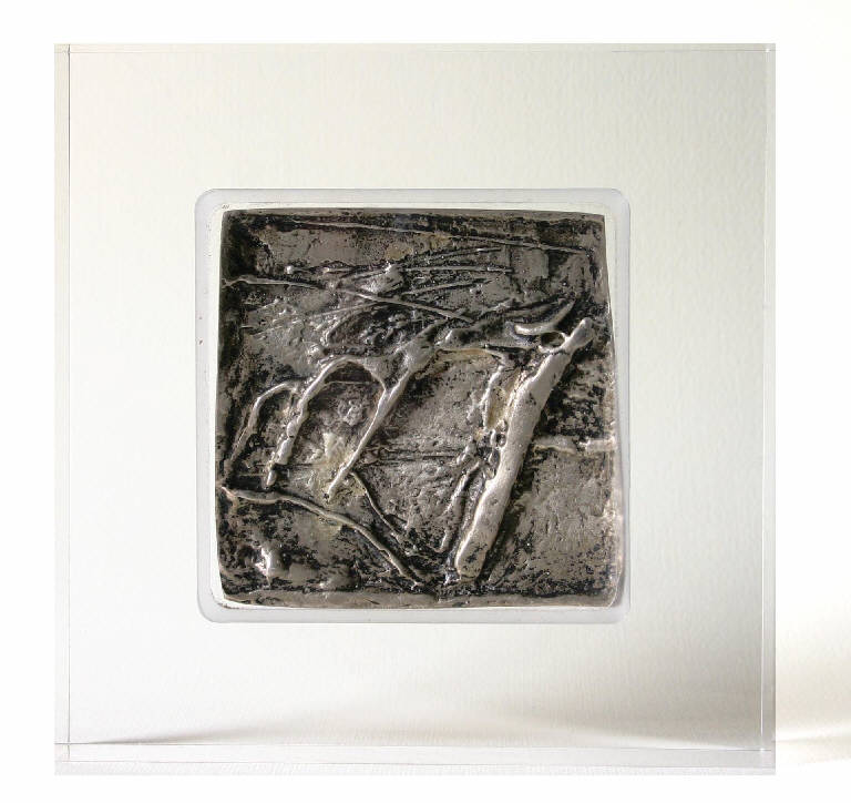 Bassorilievo di forma quadrata con linee intersecantesi a rilievo, a rappresentare le canne palustri tipiche della Lomellina. La placca in argento è inserita in una teca in plexiglass quadrata.