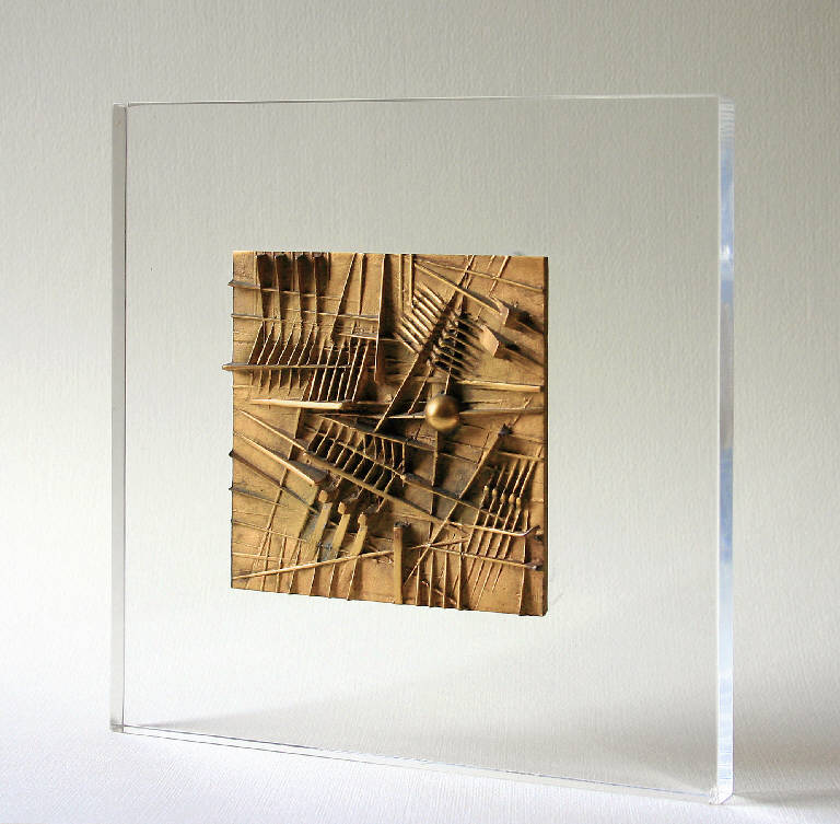 Piccolo rilievo quadrato con disegno astratto e piccola semi-sfera. E' fissato con una vite a una lastra quadrata in plexiglass. Il dott. Giorgio Forni possiede anche la prova dell'artista realizzata in resina rossa (vedi scheda 873).