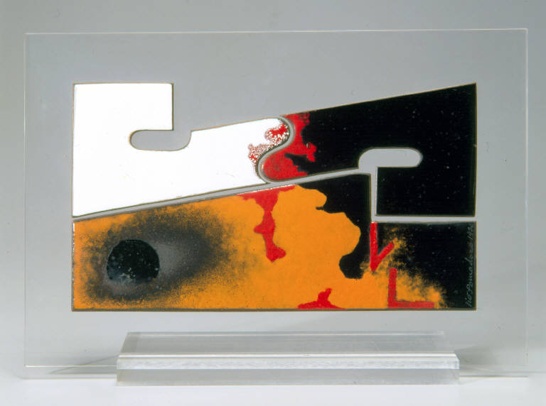 Composizione astratta in lamina di rame smaltata policroma (colori bianco, nero, rosso e arancione) in 3 parti affiancate e incollate su lastra in plexiglass.