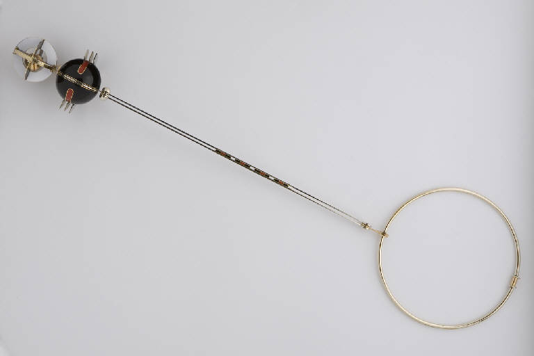 Collier rigido circolare con asta in due elementi paralleli, decorata al centro da un breve segmento con 16 piccoli rettangoli in smalto nero, rosso e bianco. Al termine dell'asta, vistoso ciondolo con un elemento sferico in smalto nero, decorato in rosso lacca, collegato a un elemento inferiore simile a una sorta di sfera armillare, all'interno della quale è inserita una sfera di oro giallo mobile. Chiusura a bauletto.