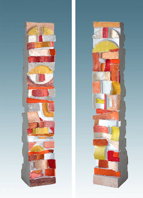 Stele in gesso colorata su due facce con i colori giallo, ocra, arancio e rosso.